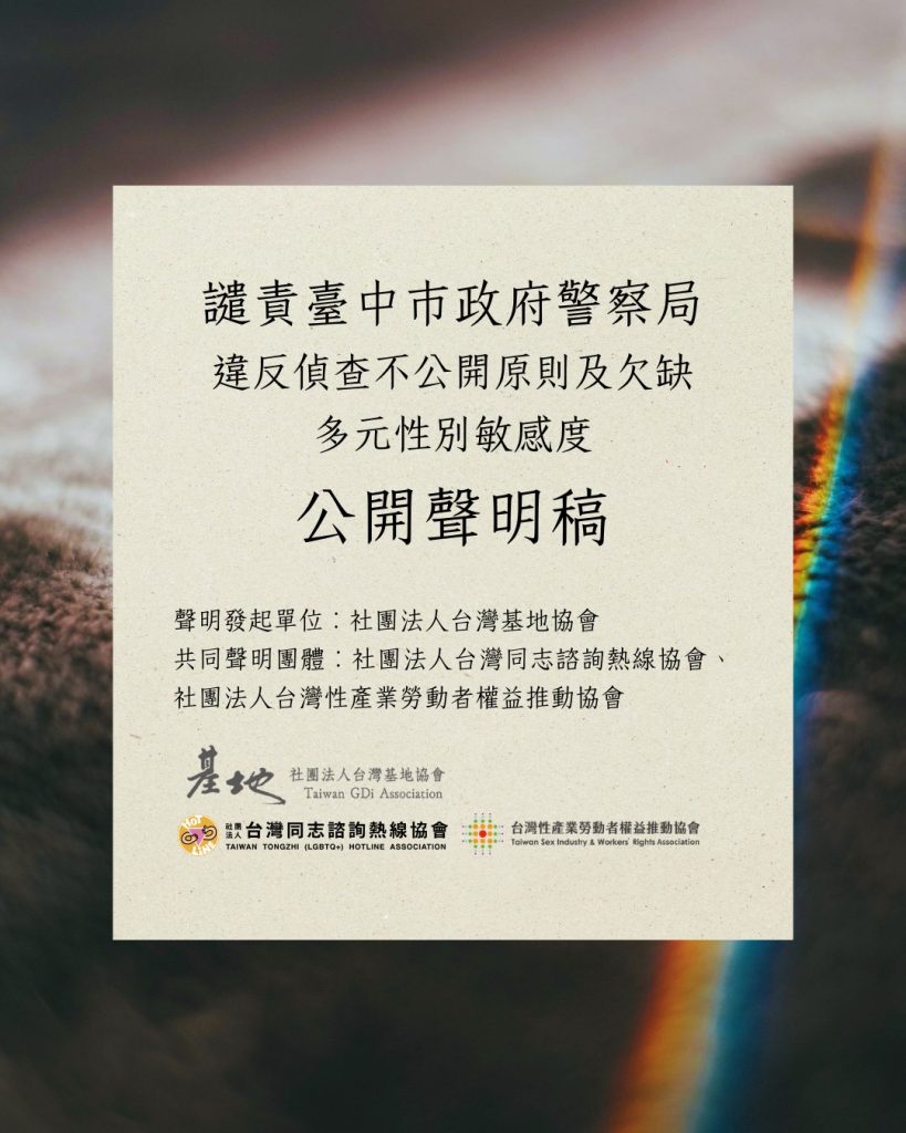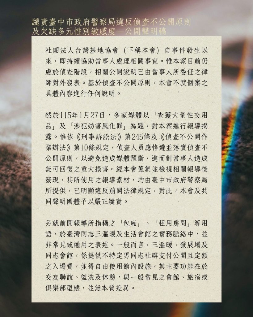 近日台中警方高調宣佈破獲逢甲商圈的一處同志交友會館。媒體以「天菜 3 帥警」、「脫到剩內褲」等獵奇標題大肆渲染。這些充滿「執法表演」意味的報導,本協會必須撕開這層「軟性敘事」的糖衣,譴責警方的治理邏輯與人權侵害。