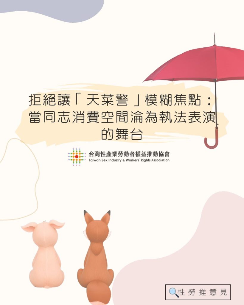 本會譴責媒體利用「天菜警」的軟性敘事來模糊焦點,這似乎能博得讀者對於「犧牲色相」下海查緝行動的好感。「喬裝員警」的正當性一直充滿爭議,特別是針對「媒介性交易」這類微罪行為,員警為了業績大費周章地喬裝、取信、甚至共同演戲,其比例原則與正當性極其匱乏。這種將員警美化為天菜的撰稿手法,不僅充滿獵奇感,更試圖用「帥氣」來加深對特定群體的刻板印象,及合理化對非常規性主體的隱私侵害與空間獵殺。